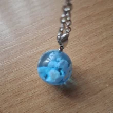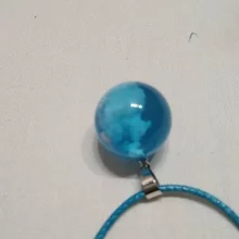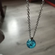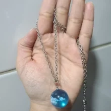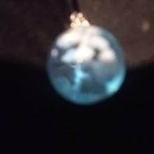 I was wearing this when a friend came over, and he instantly noticed and commented that he liked it. It's a simple necklace with a lobster clasp. My ball has a lot of "clouds" in it, but what I don't like is where the clouds contact the inside of the sphere. The touch points look like little bits of bright white paper stuck against the plastic. While I do like this necklace, I think it's more appropriate for younger women. I think a young teen would love it because it's so different. The length is also adjustable, because the manufacturer has added a 2" length of chain with larger loops in which which you hook the lobster clasp.