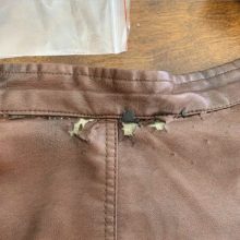 It looks better than before. I tried and tried to match the color but knew what I was missing was red for my faux leather jacket that was peeling just under the collar. Finally, I decided to try adding red acrylic paint and it didn’t take long before I had almost exactly the color I needed. I will add a couple more layers and hope it doesn’t look too much like a repair. I couldn’t wear it the way it was so I figured I couldn’t ruin it any worse.