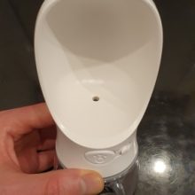 It’s a wonderful water bottle for your dog just tipping over and push a button and it fills with water and he drinks it and you throw the rest out .He gets quite a few drinks and it’s just really easy to carry round I highly recommend it~❤️